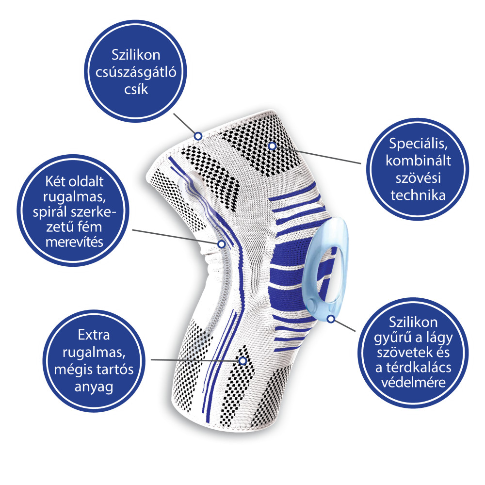 Az oldalsó spirál szerkezetű, rugalmas fém merevítésnek köszönhetően extra erős tartást biztosít a térdnek, ugyanakkor viselete mégis kényelmes.